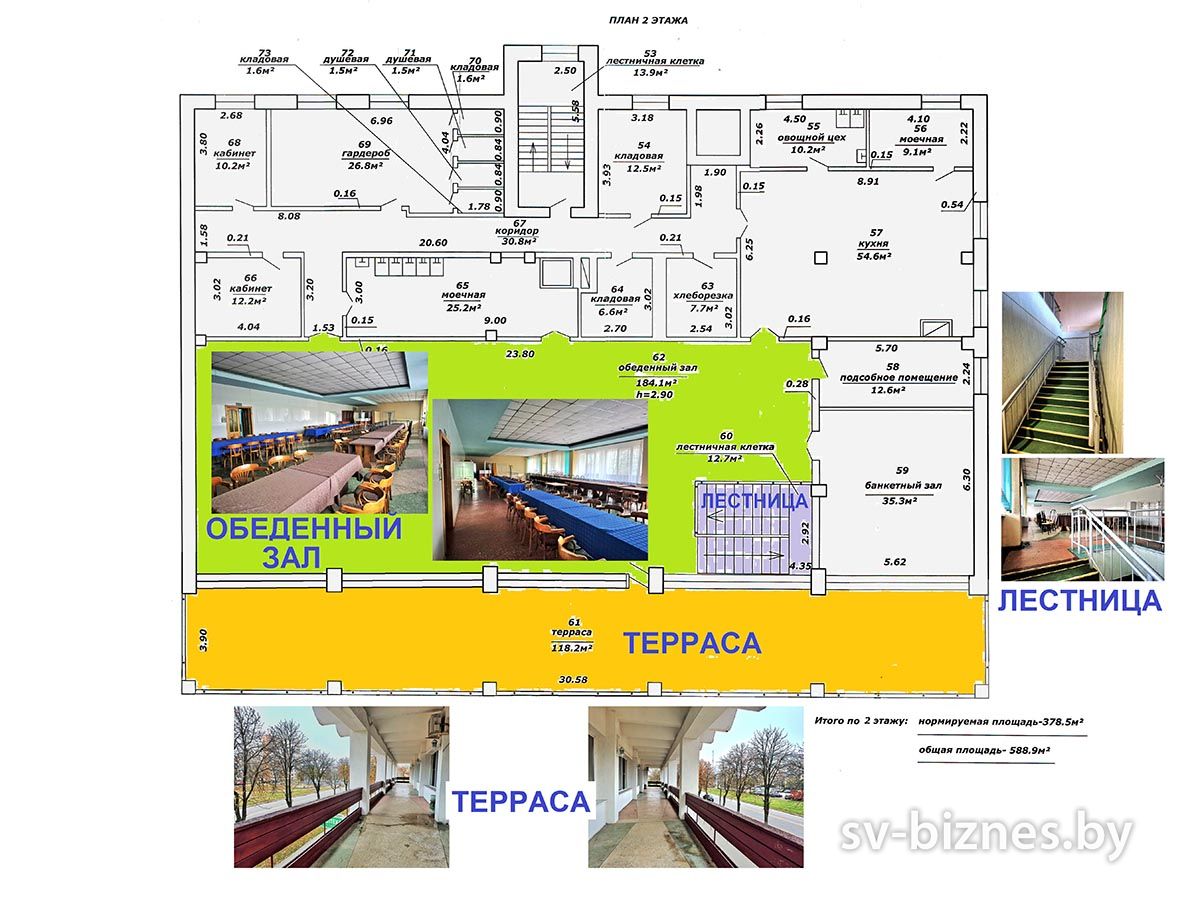 Описание Здание объекта общепита, второй этаж. Наличие обеденного зала 184,1 кв.м. банкетного зала на 35,3 кв.м. Возможно снижение арендной платы на аренду балкона.